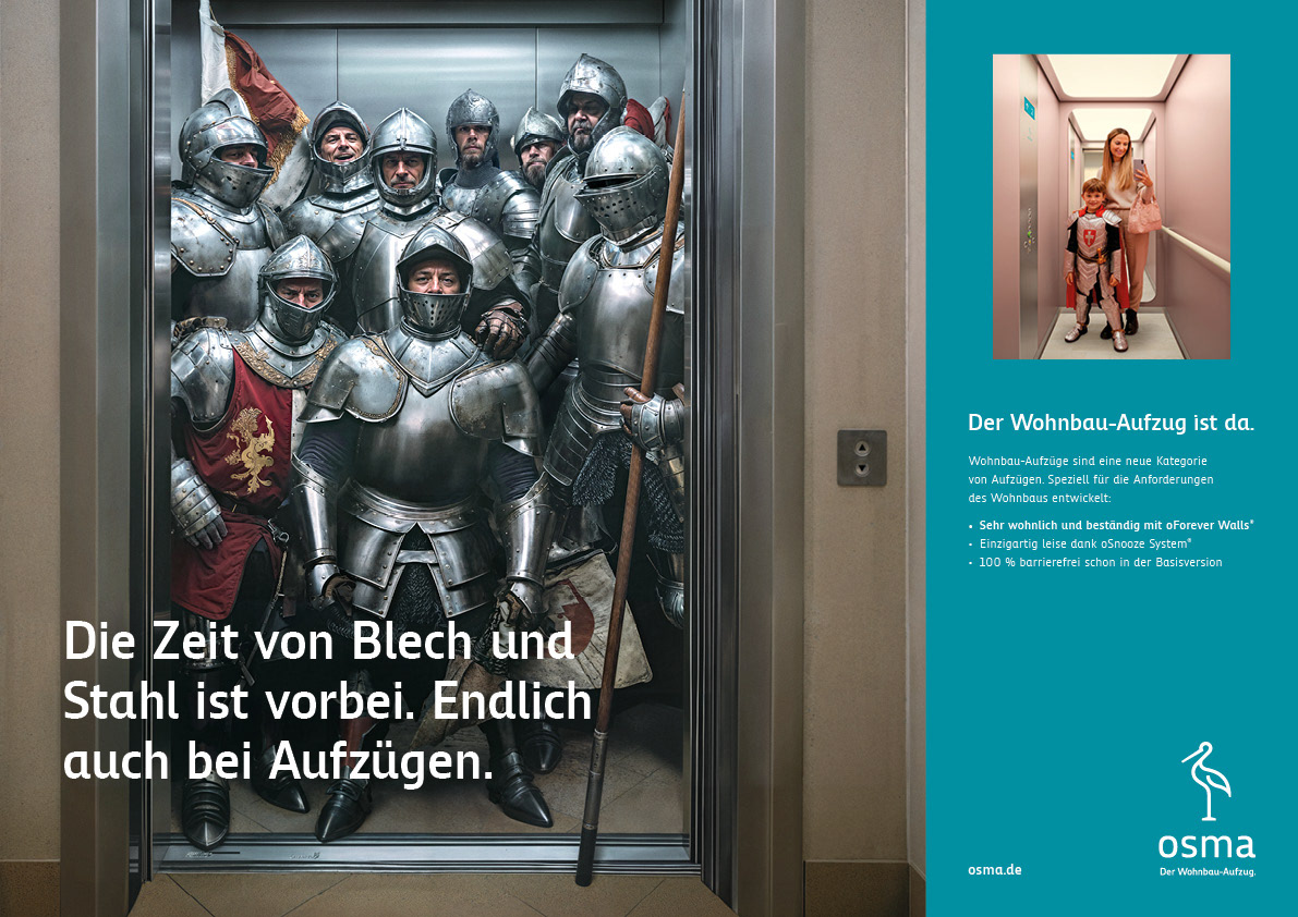 A new series of AI-generated visuals created for OSMA. AI creation by Arthur Mebius, commissioned by the creative team at Rebmann+Poguntke. These images reimagine traditional steel elevators as relics of the past. Replaced by OSMA’s modern, quiet, and accessible designs.